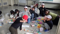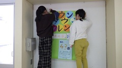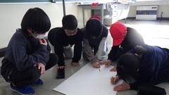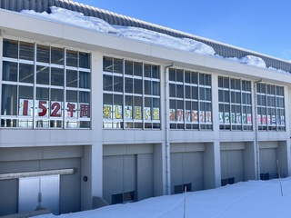 用務員さんに協力のお願いもし、プロジェクトメンバー全員での掲示作業です。掲示後は雪の残るグラウンドに出、自分たちがやり遂げたメッセージを満面の笑みで眺めました。