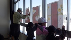 「学校や地域の人にもありがとうの気持ちを表そう」という思いから立ち上がったプロジェクト。相談の結果、体育館の窓にメッセージを貼り、地域や道行く人にも見てもらうことしました。