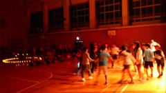1日目の夜のお楽しみはもう一つ。体育館でキャンドルサービスとフォークダンスなどを行いました。夜の学校で過ごすことは初めての子どもばかり…いつもと違う雰囲気を味わいながら、お家の方や地域の方と一緒に楽しいひと時を過ごしました。最後に、地域の方のご厚意による花火も上がり、心にのこる夜となりました。